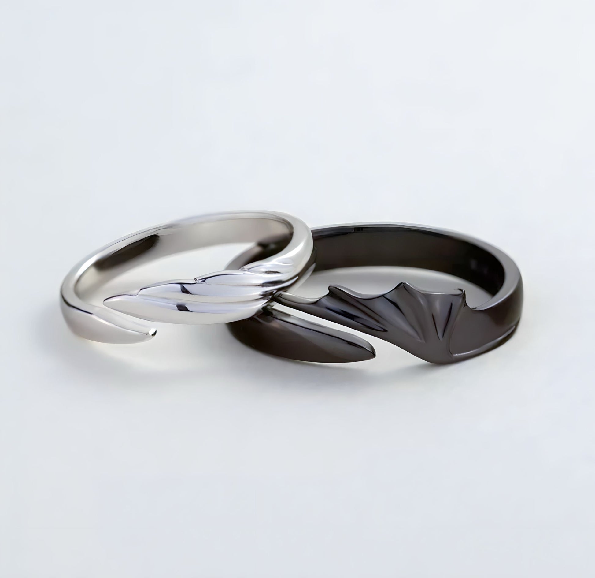 Unlike ordinary promise rings, this set features a distinct dragon-wing silhouette that interlocks perfectly when worn together. The design is inspired by themes of loyalty, courage, and protection, making it far more meaningful than basic bands. Each ring complements the other, symbolizing balance and unity. The polished silver and deep black contrast creates a powerful visual statement. This is not just jewelry—it’s a story you wear every day.